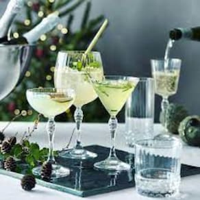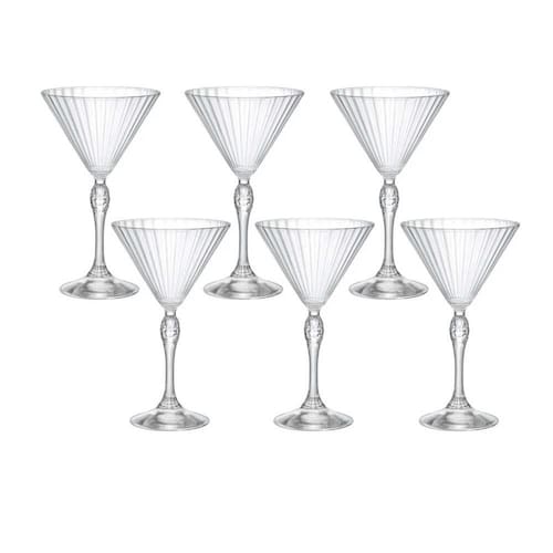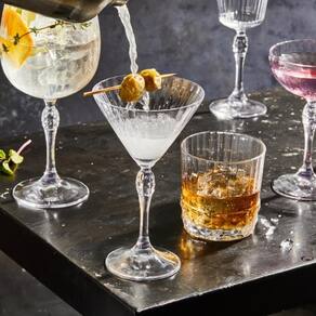 Capacidade para 245ml, é alto e fino; a base espessa é embelezada com um padrão de diamante refinado, enquanto facetas densas correm ao longo do Cristal.