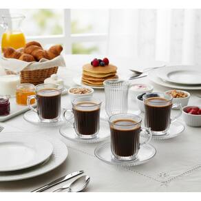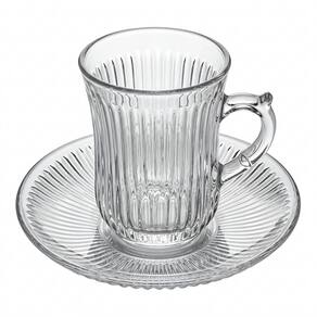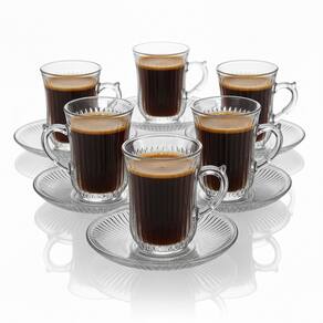 - Material: Vidro canelado na parte interna - Cor: Transparente - Quantidade: 6 Xícaras e 6 Pires - Embalagem: Caixa litografada