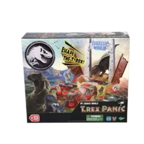 "Explore o Jurassic World com T.Rex Panic da EPOCH Games! Siga os dados e mova suas peças antes que os Dinossauros ataquem você! Tente escapar dos Dinossauros ao embarcar nestas aventuras!