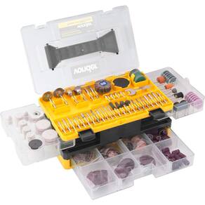 1 Jogo de acessórios para microrretífica, composto por: 1 disco diamantado, 30 lixas cilíndricas, 2 rodas de pano, 12 rodas de feltro, 2 pontas com feltro, 1 roda de borracha, 4 limas rotativas, 2 hastes para lixas cilíndricas, 11 limas rotativas diamantadas, 3 pontas montadas de óxido de alumínio, 6 rebolos de óxido de alumínio, 3 pontas montadas de carbureto de silício, 6 rebolos de carbureto de silício, 3 escovas de inox, 3 escovas de latão, 1 pasta para polimento, 108 discos de corte, 135 discos de lixa, 4 pinças para microrretífica, 1 haste para discos de corte, 1 haste para discos de borracha, 1 haste para discos de lixa, 1 haste para discos de feltro, 2 discos de corte de fibra de vidro, 1 chave para microrretífica, 1 roda de lixa (grão 80), 1 bastão abrasivo e 4 pontas montadas de borracha