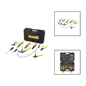 O Jogo de Alicates para Abraçadeiras com 9 peças é indispensável para quem busca precisão e eficiência na manutenção automotiva e industrial Com um sistema de travamento que mantém a abraçadeira metálica aberta, facilita a instalação e remoção, economizando tempo e esforço. Seu design ergonômico, com cabo revestido em PVC, garante conforto e reduz a fadiga durante o uso prolongado. Inclui um alicate flexível com pontas para alcançar abraçadeiras em locais de difícil acesso, além de diversos modelos específicos para diferentes aplicações, como mangueiras de combustível, óleo, água e ar-condicionado. Acompanha uma chave manual com ponta Phillips e fenda e uma maleta plástica para organização e transporte