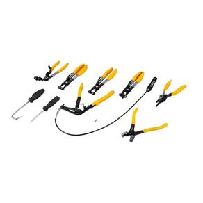 O Jogo de Alicates para Abraçadeiras com 9 peças é indispensável para quem busca precisão e eficiência na manutenção automotiva e industrial Com um sistema de travamento que mantém a abraçadeira metálica aberta, facilita a instalação e remoção, economizando tempo e esforço. Seu design ergonômico, com cabo revestido em PVC, garante conforto e reduz a fadiga durante o uso prolongado. Inclui um alicate flexível com pontas para alcançar abraçadeiras em locais de difícil acesso, além de diversos modelos específicos para diferentes aplicações, como mangueiras de combustível, óleo, água e ar-condicionado. Acompanha uma chave manual com ponta Phillips e fenda e uma maleta plástica para organização e transporte