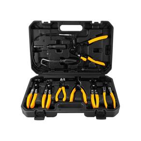 O Jogo de Alicates para Abraçadeiras com 9 peças é indispensável para quem busca precisão e eficiência na manutenção automotiva e industrial Com um sistema de travamento que mantém a abraçadeira metálica aberta, facilita a instalação e remoção, economizando tempo e esforço. Seu design ergonômico, com cabo revestido em PVC, garante conforto e reduz a fadiga durante o uso prolongado. Inclui um alicate flexível com pontas para alcançar abraçadeiras em locais de difícil acesso, além de diversos modelos específicos para diferentes aplicações, como mangueiras de combustível, óleo, água e ar-condicionado. Acompanha uma chave manual com ponta Phillips e fenda e uma maleta plástica para organização e transporte