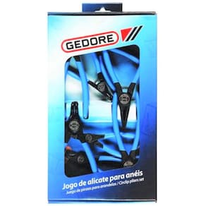 Jogo De Alicates Para Anéis 4 Peças C8000A Gedore Corpo em aço GEDORE-Vanadium com acabamento escurecido. Empunhadura plastificada. Alicate com pontas fixas e retas. Possui mola para regulagem da abertura. Para anéis de segurança externos conforme norma DIN 471 e DIN 983. Acompanha 01 - 8000 A 2 alicate para anéis externos, pontas retas 01 - 8000 A 21 alicate para anéis externos, pontas curvas 90º 01 - 8000 J 2 alicate para anéis internos, pontas retas 01 - 8000 J 21 alicate para anéis internos, pontas curvas 90º Dicas de segurança: Respeite as normas profissionais de segurança e o uso dos EPIs. Sempre utilize o alicate com a aplicação correspondente ao anel interno ou externo, para que obtenha o desempenho desejado. Não exponha o alicate ao calor excessivo, para não comprometer as características do produto. Não utilize tubos ou extensões para prolongar o comprimento do alicate. Não golpeie o alicate para anéis. Não altere a forma do alicate para anéis. Não exponha / armazene o alicate para anéis em ambientes ácidos, úmidos ou salinos. Após o uso limpe visando prolongar a vida útil e garantir o bom funcionamento do alicate. Marca: Não Informado