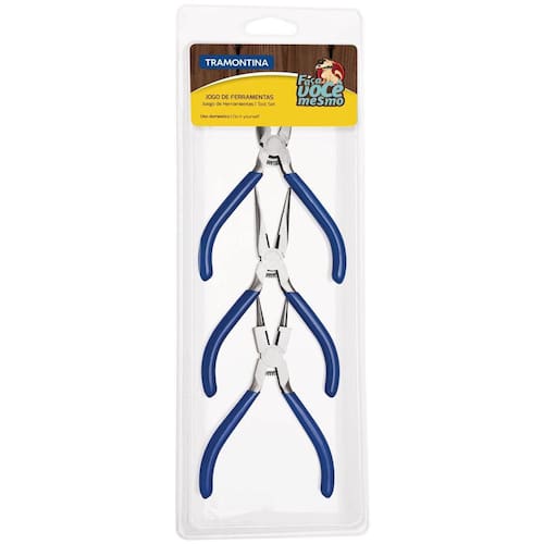 Trabalhos manuais exigem talento, disposição e, é claro, ferramentas que facilitem a sua vida. O Jogo de Alicates para Bijuteria Tramontina 3 Peças é feito para você que pretende atuar na confecção doméstica de bijuterias, afinal, com os três modelos disponíveis é possível puxar, prender, enrolar, deformar e cortar fios e arames moles sem problema algum. Solte a imaginação e conte com a gente! Orientações Corpo forjado em aço especial.Cabeça e articulação lixadas.Têmpera especial no gume de corte e mandíbulas.Cabos com revestimento especial.O aço carbono especial empregado na fabricação dos mordentes, aliado à têmpera garantem maior resistência.Sistema de rebites especialmente projetado para aumentar a resistência do produto.Formato ergonômico para maior conforto.As ferramentas são produzidas e testadas conforme normas específicas. Características Gerais EAN13 7891114068993 DUN14 17891114068990 NCM 8203.20.10 Peso Líquido 0,2000 kg. Peso Bruto 0,2000 kg. Metragem 0,000842 m³. Dimensões Embalagem (Compr. X Larg. X Alt.) 255x 110x 30 mm. Observações Use óculos, luvas e outros equipamentos de proteção de acordo com a tarefa a ser executada. Observe as indicações de uso de cada tipo de alicate ou torquês. Nunca utilize um alicate ou torquês para cortar arames endurecidos, a não ser que tenha sido projetado para este fim. Nunca utilize o alicate ou torquês como martelo. Ele pode trincar ou até mesmo quebrar. Nunca exponha os alicates ou torqueses ao calor excessivo. Isto pode alterar o tratamento térmico aplicado no corte e afetar o seu desempenho. Sempre posicione o corte do alicate ou torquês perpendicularmente ao eixo do arame para uma operação mais rápida e segura. Utilize alicates isolados, identificados pela marcação 1.000 V no cabo, quando for necessário trabalhar em locais com corrente elétrica. Importante: nestes casos, inspecione a integridade da isolação elétrica, e, se aparecerem trincas na isolação, suspenda o uso imediatamente.Nunca aumente o comprimento dos cabos dos alicates ou torqueses. Isto amplifica a força exercida sobre a cabeça da ferramenta podendo quebrá-la.Nunca utilize o alicate ou torquês em porcas e parafusos. Para estes trabalhos, indica-se o uso de chaves de aperto.Lubrifique periodicamente a articulação. Isto aumenta a vida útil do produto e melhora sua performance.Armazene em local limpo e seco.
