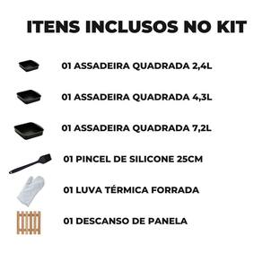 01 Assadeira N1 01 Assadeira N2 01 Assadeira N3 01 Luva Térmica de Cozinha 01 Pincel Culinário de Silicone 01 Descanso de Panela