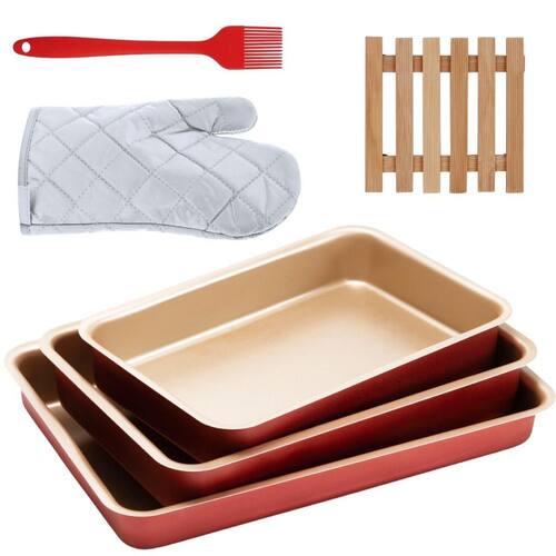 01 Assadeira N1 01 Assadeira N2 01 Assadeira N3 01 Luva Térmica de Cozinha 01 Pincel Culinário de Silicone 01 Descanso de Panela