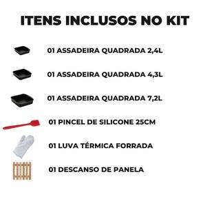 01 Assadeira N1 01 Assadeira N2 01 Assadeira N3 01 Luva Térmica de Cozinha 01 Pincel Culinário de Silicone 01 Descanso de Panela