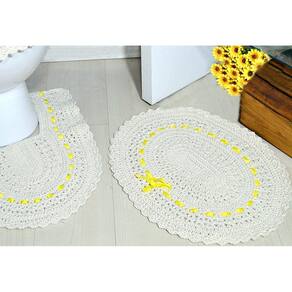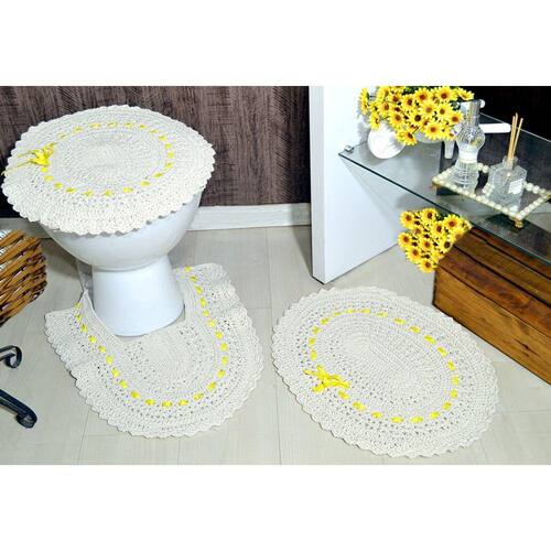 Jogo de banheiro crochetado à mão em barbante, na cor cru, detalhes em fitas na cor amarelo.