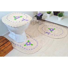 Jogo de banheiro crochetado à mão em barbante, na cor cru, detalhes em fitas e flores lilás e folhas verdes.