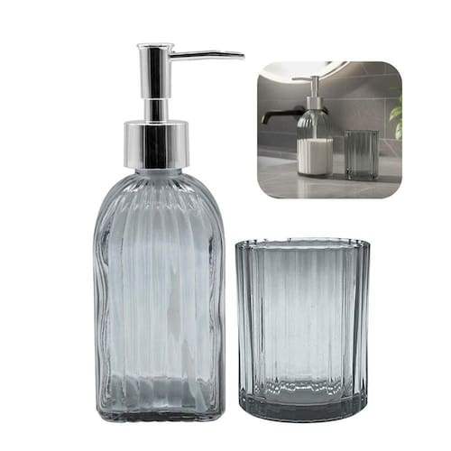 Organiza e dispensa itens de higiene pessoal, como sabonete líquido e acessórios, por meio de um conjunto de duas peças fabricadas em vidro na tonalidade cinza. O material de vidro contribui para a higiene, pois não absorve odores, não reage com os produtos e facilita a limpeza e manutenção, auxiliando na conservação dos itens armazenados.