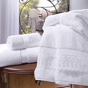 Detalhes do produto: Bouton: Jogo de Toalhas 05 Peças Branca Bouton Descrição do Produto: Jogo de Toalhas de Banho com renda, na cor Branca, em fio penteado 100% Algodão Egípcio, exceto no efeito decorativo. Toalhas em tamanho especial, acompanham uma toalha de piso, deixando o ambiente completo. Linda, elegante fica bem em qualquer banheiro Características Toalha felpuda 100% algodão exceto efeito decorativo Imagem meramente ilustrativa - 02 Toalhas de Banho 81cmx1,50m - 02 Toalhas de Rosto 0.50x0.80m - 01 Piso 0.50x0.80m - Barra em Jacquard com aplicação de Renda - Gramatura: 500g/m² - Marca: Bouton