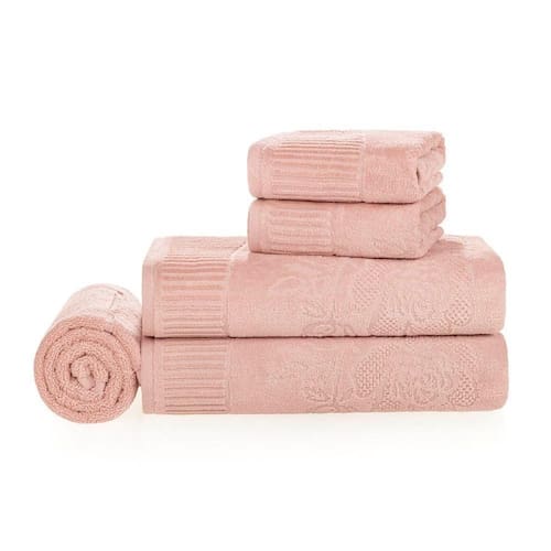 O Jogo de Banho Karsten Grace Rosa Suave, composto por 5 peças 100% algodão é um conjunto completo que proporciona luxo e conforto para sua casa. São 2 toalhas de banho de 66cm x 1,40m, 2 toalhas de rosto de 48cm x 70cm e 1 toalha de piso de 48cm x 70cm que oferecem praticidade e estilo. As peças têm toque super macio e alta absorção. O corpo aveludado em Jacquard apresenta um desenho de flores em relevo e uma experiência única de maciez. Sua gramatura de 440g/m somado ás tecnologias Softmax e Unika, formam um produto com volume, toque super macio super absorção e antipilling e somados, formam um produto de qualidade e com vida útil muito maior.