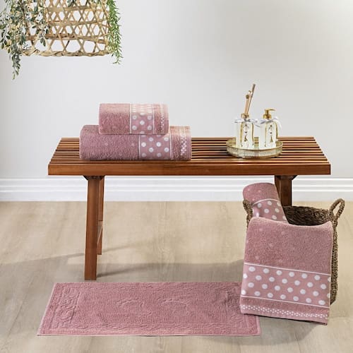 Descubra o toque macio e o design elegante do Jogo de Banho Meggy Poá. Composto por 5 peças essenciais – 2 Toalhas de Banho, 2 Toalhas de Rosto e 1 Piso, este conjunto foi pensado para elevar a sua experiência diária de autocuidado, proporcionando conforto e sofisticação.