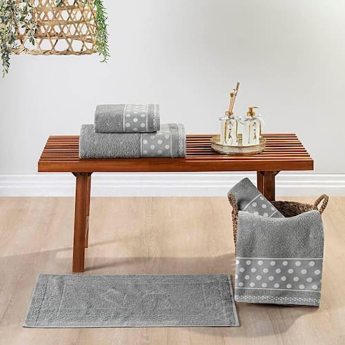 O design com efeito decorativo de bolinhas adiciona um toque de elegância e sofisticação, tornando as toalhas não apenas funcionais, mas também belas peças de decoração para o seu banheiro. A alta qualidade do algodão garante durabilidade, mantendo a suavidade e a capacidade de absorção mesmo após várias lavagens.