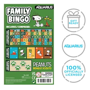 - Os fãs de SNOOPY se alegram! : Fãs de Peanuts, Snoopy, Woodstock e Beagle Scout, este jogo de bingo AQUARIUS foi feito para você. O conjunto inclui 18 cartas de bingo e não apenas parece legal, é igualmente divertido para crianças e adultos