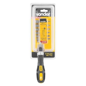 Jogo de bits/ponteiras com 20 peças, encaixe sextavado 1/4, vonder Indicado para fixar e soltar parafusos em geral Produzido em aço cromo vanádio, proporcionando maior resistência e durabilidade. Possui acabamento fosfatizado que aumenta a proteção contra oxidação/corrosão. Conteúdo da embalagem: -1 cabo anatômico em polipropileno revestido com borracha termoplástica com encaixe magnético -3 fenda 4 mm, 5 mm e 6 mm -3 phillips n 1, n 2 e n 3 -6 hexalobular t10, t15, t20, t25, t27 e t30 -7 soquetes sextavados 5 mm, 6 mm, 7 mm, 8 mm, 9 mm, 10 mm e 11 mm Informações técnicas: -material do bits ponteira:aço cromo vanádio -acabamento do bits:fosfatizado -tipo do encaixe do bits:sextavado - 1/4 6,35 mm -comprimento total do bits/ponteira:3 bits fenda - 25 mm / 3 phillips - 25 mm / 6 hexalobular 25 mm / 7 soquetes - 40 mm Imagem meramente ilustrativa Ean: 7893946103606