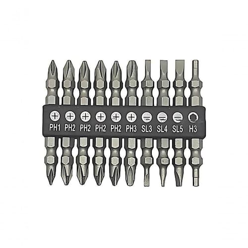 Pratique, preciso e de alta performance, o Jogo de Bits Ponta Dupla Western é a solução para você que busca agilidade na hora de apertar e desapertar parafusos. Composto por 10 bits de alta durabilidade fabricados em cromo vanadio, o jogo oferece ampla versatilidade para atender às suas necessidades: 3 fendas nos tamanhos 3mm, 4mm e 5mm para parafusos-fenda tradicionais, e 6 pontas Philips nos tamanhos #1, #2 (#2 repetido por sua grande demanda), para parafusos tipo Phillips, além de uma ponta Hex de 3mm para parafusos hexagonal.