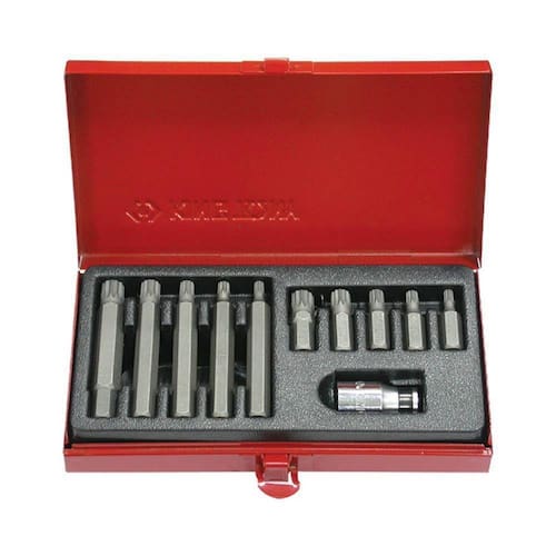 Jogo de bits intercambiáveis multidentado com encaixe de 1/2 polegada. São fabricados em aço resistente, oferecendo durabilidade e ótimo desempenho. Acompanha um estojo para melhor organização das peças e segurança no transporte. Marca: King Tony Características: -pontas multidentadas. -encaixe: 1/2. -fabricado em aço resistente. Conteúdo: -5 Bits 80mm: 12, 10, 8, 6 e 5. -5 Bits 36mm: 12, 10, 8, 6 e 5. -1 Adaptador 1/2 x 10mm. -1 Estojo metálico. Aplicação: Ideal para carros, motocicletas, bicicletas, máquinas e outros. Código: 1011MQ