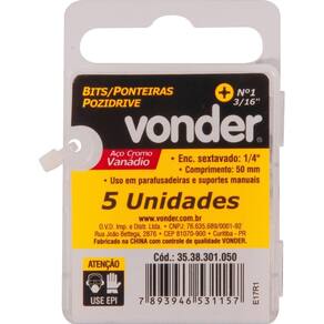Conteúdo Embalagem:1 Cartela com 5 bits ponteira pozidriveDestaques e diferenciais:Produzido em aço cromo vanádio, proporcionando maior resistência e durabilidade. Possui acabamento fosfatizado, que aumenta a proteção contra oxidação/corrosão.Aplicações e dicas de uso:Indicado para fixar e soltar parafusos com encaixe pozidrive. Utilizado em parafusadeiras e suportes manuais.Características Técnicas:Material do Bits ponteira: Aço cromo vanádio Acabamento do Bits: Fosfatizado Comprimento total do bits pozidrive: 50 mm Número da ponta do bits pozidrive: Nº1 - 3/16 Tipo do encaixe do bits: Sextavado - 1/4 : legal: 90 dias Marca: Não Informado