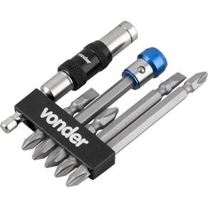 1 Jogo com 8 peças, sendo: 5 bits/ponteiras duplos (3 PH2/PH2; 2 PH2/fenda 6 mm), 1 extensão magnética articulada, 1 anel magnético e 1 suporte plástico.