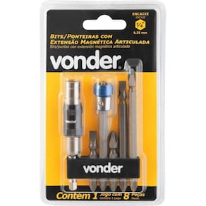 1 Jogo com 8 peças, sendo: 5 bits/ponteiras duplos (3 PH2/PH2; 2 PH2/fenda 6 mm), 1 extensão magnética articulada, 1 anel magnético e 1 suporte plástico.
