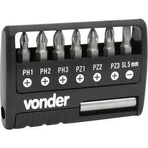 1 Jogo de bits/ponteiras com encaixe sextavado de 1/4, composto por 9 peças, sendo: 3 bits/ponteiras fenda cruzada/philips (PH1, PH2 e PH3), 3 bits/ponteiras pozidrive (PZ1, PZ2 e PZ3), 1 bits/ponteira fenda (SL 5 mm), 1 soquete magnético 1/4 e 1 suporte para bits/soquete