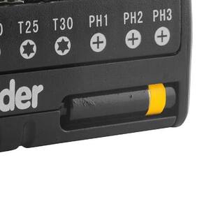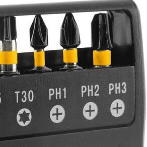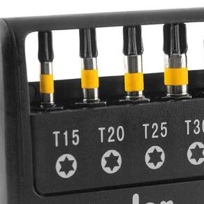O jogo de bits/ponteiras com encaixe sextavado de 1/4 POL é composto por 9 peças, sendo: 3 bits/ponteiras fenda cruzada/philips (PH1, PH2 e PH3), 4 bits/ponteiras hexalobular (T15, T20, T25 e T30), 1 soquete magnético 1/4 POL e 1 suporte para bits/soquete. Possui zona de torção estendida, que amplia a vida útil do bits.