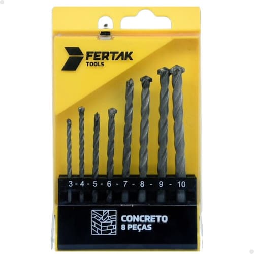 Jogo De Brocas 8 Peças Para Concreto Fertak Fabricadas em aço especial de alta qualidade e resistência Marca: Fertak Referência:1203 Contém 8 peças, com medidas: 3mm x 60mm 4mm x 75mm 5mm x 85mm 6mm x 100mm 7mm x 100mm 8mm x 120mm 9mm x 120mm 10mm x 120mm Acompanha suporte plástico para armazenamento das brocas Dúvidas utilizar o campo de perguntas. A equipe da Planeta energia agradece a visita . Boas Compras