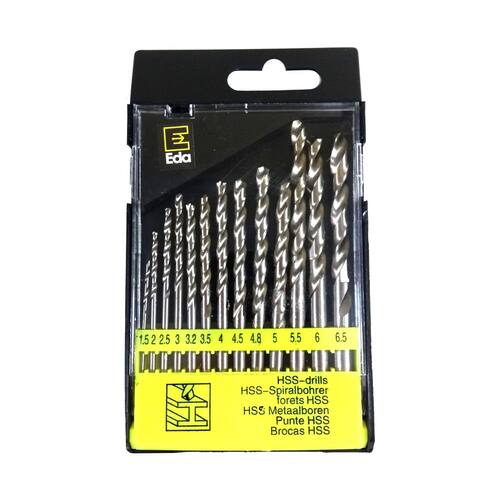 Jogo de brocas EDA são de excelente qualidade, da linha profissional da EDA e acompanham prático estojo plástico para transporte e organização das brocas. O kit contém treze diferentes medidas para completar seu jogo de acessórios. Características: Marca: EDA Modelo: HSS Em aço rápido Para uso em metais Com 13 brocas: 1,5; 2; 2,5; 3; 3,2; 3,5; 4; 4,5; 4,8; 5; 5,5; 6 e 6,5mm Linha profissional Com estojo de plástico para transporte e organização das brocas Dimensões do estojo: 13,5cm x 8cm Peso bruto: 120g Ideal para furar metais. Garantia: 90 dias Ean: 7895315013912