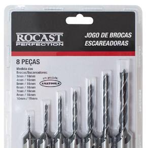 Jogo de brocas escareadoras 8 peças 366,0004 - rocast, é utilizada para escarear furos na madeira, ou seja, abrir um pouco o diâmetro na finalização do furo. É bastante utilizada para realizar um chanfro/rebaixo no furo para permitir que a cabeça do parafuso fique embutida na madeira. Permite furar e escarear o furo ao mesmo tempo.