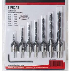 Broca escareadora 3x16 mm. Broca escareadora 4x16 mm. Broca escareadora 5x16 mm. Broca escareadora 6x16 mm. Broca escareadora 7x16 mm. Broca escareadora 8x16 mm. Broca escareadora 10x19 mm. 1 chave allen.