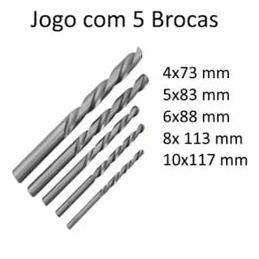 Jogo de brocas para metal - kit 5 peças completo Jogo com 5 brocas: - 5 brocas de aço rápido Descrição do produto: Brocas de aço rápido: - medidas das brocas: 4, 5, 6, 8 e 10 mm. - brocas com pontas resistentes para mais rapidez no furo com menos esforço. O kit de brocas é muito adequado para a utilização para furos em uma variedade de materiais, incluindo metal, madeira plastico aluminio, etc. Marca: Não Informado Ean: 7895688656112