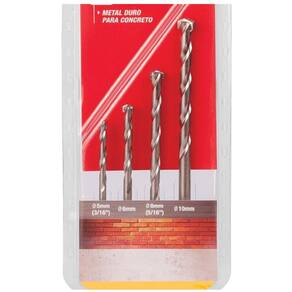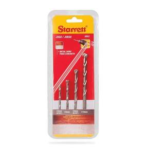 ESPECIFICAÇÕES: - Tipo / aplicação: Concreto- Brocas:- Diâmetro: 5,0 mm / Comprimento total: 90 mm / Comprimento canal: 39 mm- Diâmetro: 6,0 mm / Comprimento total: 100 mm / Comprimento canal: 54 mm- Diâmetro: 8,0 mm / Comprimento total: 120 mm / Comprimento canal: 80 mm- Diâmetro: 10,0 mm / Comprimento total: 150 mm / Comprimento canal: 80 mmITENS QUE ACOMPANHAM:- 4 Peças