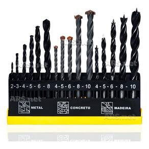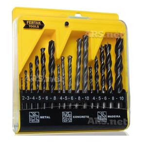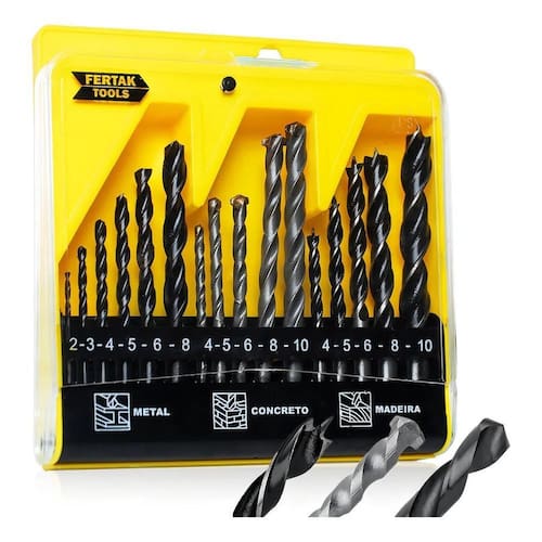 Descrição Jogo De Brocas Madeira Concreto e Metal 16 Peças Fertak 1202 Kit composto por brocas para madeira 3 pontas 5 brocas , alvenaria e concreto com ponta de vídea 5 brocas e metal HSS 6 brocas de tamanhos variados, formando um conjunto muito útil para ter em casa, pois atende a maior parte das necessidades. O kit é acondicionado em um prático estojo.