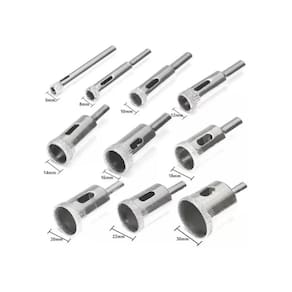 Kit contendo 10 serras copo diamantadas XF. Broca diamantada revestida fura um círculo completo de vidros, mármore, granito, espelhos, garrafas, pisos, azulejos e cerâmicas.