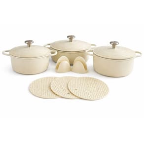 O Jogo é composto por 01 Caçarola de 20 cm, 01 Caçarola de 24 cm e 01 Caçarola de 26 cm. Além disso também vem incluso pegadores e descansos de silicone.