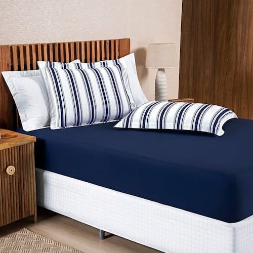 Jogo De Cama 100% Algodão Marin Casal Padrão 03 Peças - Marinho O Jogo de Cama Marin é uma escolha perfeita para quem busca conforto e qualidade. Feito com tecido de malha 100% ALGODÃO, fio 30/1 penteado, ele é resistente e não forma bolinhas com o tempo. As fronhas apresentam estampas em listras encantadoras, enquanto o lençol de baixo é liso e possui elástico em toda a volta, garantindo um ajuste perfeito ao colchão. Com o Jogo de Cama Marin, seu quarto terá um visual aconchegante e cheio de charme. O que vai na embalagem: