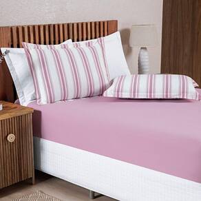 Jogo De Cama 100% Algodão Marin Casal Padrão 03 Peças - Rosê O Jogo de Cama Marin é uma escolha perfeita para quem busca conforto e qualidade. Feito com tecido de malha 100% ALGODÃO, fio 30/1 penteado, ele é resistente e não forma bolinhas com o tempo. As fronhas apresentam estampas em listras encantadoras, enquanto o lençol de baixo é liso e possui elástico em toda a volta, garantindo um ajuste perfeito ao colchão. Com o Jogo de Cama Marin, seu quarto terá um visual aconchegante e cheio de charme. O que vai na embalagem: