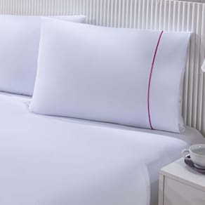 O Jogo de Cama Gran Moratta é confeccionado com tecido Percal 100% Algodão, é Branco e possui um toque de cor em seu detalhe em .