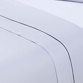 O Jogo de Cama Gran Moratta é confeccionado com tecido Percal 100% Algodão, o lençol de baixo e a fronha são Brancos e o lençol de cima possui cor suave e detalhe em Vivo.
