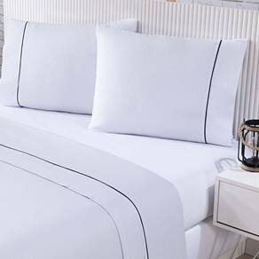 O Jogo de Cama Gran Moratta é confeccionado com tecido Percal 100% Algodão, o lençol de baixo e a fronha são Brancos e o lençol de cima possui cor suave e detalhe em .