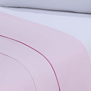 O Jogo de Cama Gran Moratta é confeccionado com tecido Percal 100% Algodão, o lençol de baixo e a fronha são Brancos e o lençol de cima possui cor suave e detalhe em Vivo.