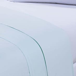 O Jogo de Cama Gran Moratta é confeccionado com tecido Percal 100% Algodão, o lençol de baixo e a fronha são Brancos e o lençol de cima possui cor suave e detalhe em Vivo.