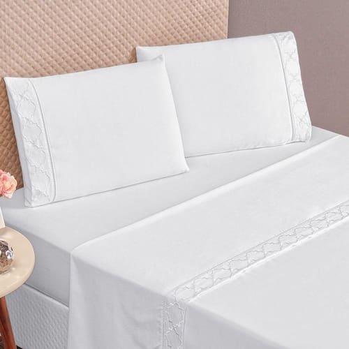 Jogo De Cama 300 Fios Bordado Queen Infinity 04 Peças - Branco O Jogo de Cama Infinity é a peça chave que falta para você ter um quarto perfeito, confeccionado em tecido Micropercal 300 fios proporciona suavidade, conforto e sofisticação para seu quarto! Tecido Micropercal 300 FiosLençol de baixo com elástico em toda sua volta. O Que Vai Na Embalagem: 01 Lençol De Cima 2,40m X 2,40m01 Lençol De Baixo C/ Elástico P/ Colchão De 1,98m X 1,58m X 30cm De Alt.02 Fronha 70cm X 50cm Composição: Tecido: 100% Poliéster Recomendações gerais para conservação de sua peça: - Lavável em casa, mas verifique a capacidade de sua lavadora.- Temperatura máxima de lavagem 30C, processo de lavagem normal.- Usar sabão em pó e amaciante com moderação.- Cuidado com as misturinhas caseiras, elas podem manchar o produto.- Não usar alvejante.- Não é permitido secagem na máquina.- Não passar a ferro.- Secar em superfície plana.- Secar à sombra- Antes de realizar a lavagem do produto, sugerimos que separe as peças coloridas e claras, para diminuir as chances de sua peça manchar. A cor do produto é exatamente igual a foto? - A cor pode modificar um pouco de aparelho para aparelho, apesar disso não interfere na beleza do produto. Ean: 7908125117951
