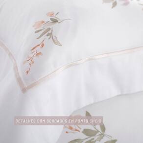 A coleção Vision Flora apresenta um espetáculo visual: flores vibrantes e ramos aquarelados ganham vida sobre uma base branca impecável. O acabamento em bordado ponto cheio cria molduras elegantes que elevam o design a um nível artístico, tornando sua cama o verdadeiro centro das atenções.
