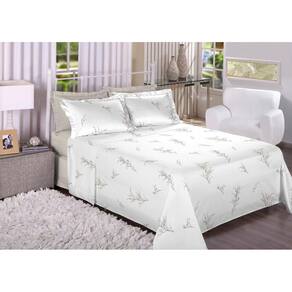 1 lençol, de 2,20 m x 2,47 m com dobra feita; 1 lençol com elástico, de 1,40 m x 1,90 m x 30 cm; 2 fronhas, de 50 cm x 70 cm com abas.