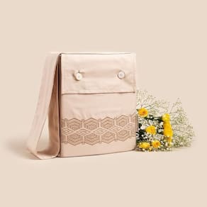 Juntamente com o jogo de cama, temos sua embalagem, produzida com o mesmo material e com acabamentos exatamente iguais ao jogo de cama. Seu fechamento é com botões de Madrepérola - uma substância rica em calcário que é extraída da parte interna das conchas da praia. Este material é 100% natural e possui aspecto perolizado, tornando a embalagem ainda mais nobre.