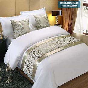 1 lençol com elástico para colchões de até 40 cm de altura - lençol branco algodão percal 200 fios. 1 edredom dupla face com enchimento 260cmx260cm - edredom branco algodão percal 200 fios, acabamento em estilo futon italiano totalmente embutido, sem a necessidade de costuras tradicionais prejudicando o visual do seu decor. 2 capas de travesseiros de 70cm x 50cm sem enchimento - capas em algodão percal 200 fios, com barra estilo italiano. 2 almofadas de 50x50cm em cetim gold light e detalhes em estampa digital estilo brasão real em cor off white - almofadas acompanham enchimento em fibra siliconada revestida por polipropileno. 1 peseira dupla face de 260cm por 0,80cm em cetim gold light em estampa digital estilo brasão real em cor off white. Atenção: não tralhamos com cobre leito, o kit não acompanha o lençol de cima.
