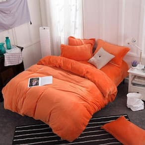 O que vem no Kit: 1 lençol com elástico para colchões tamanho casal super king de até 40cm de altura - Tecido sued laranja. 1 edredom dupla face com enchimento 300x300cm - Tecido sued laranja 4 capas de travesseiros de 70cm x 50cm - Tecido sued laranja - Capa de travesseiro sem enchimento. 1 Almofada de 45x45 cm com enchimento em fibra siliconada - Tecido sued bege, e botão estilo futon preto.